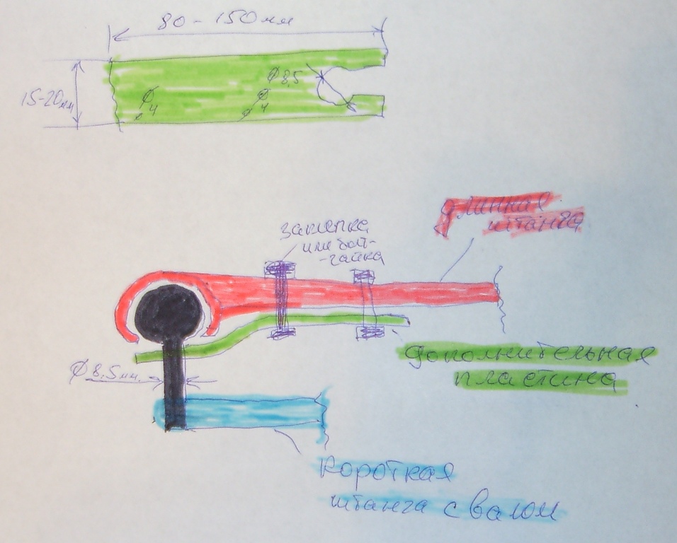 6. Заводим изготовленную пластину вырезом под шарнир и прикрепляем ее к штанге любым доступным способом (заклепки, саморезы, болт-гайка). Одно отвестие на штаге уже имеется!