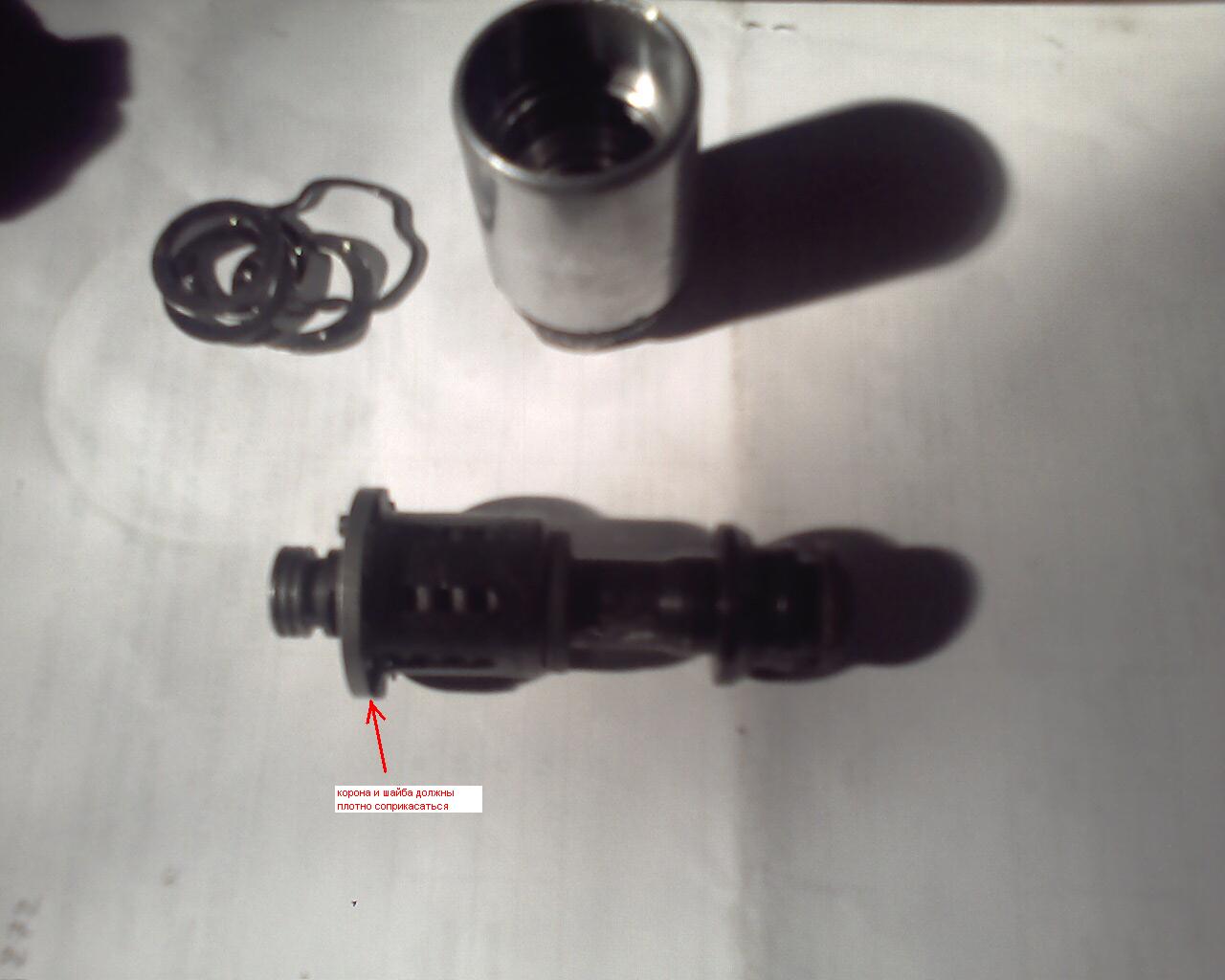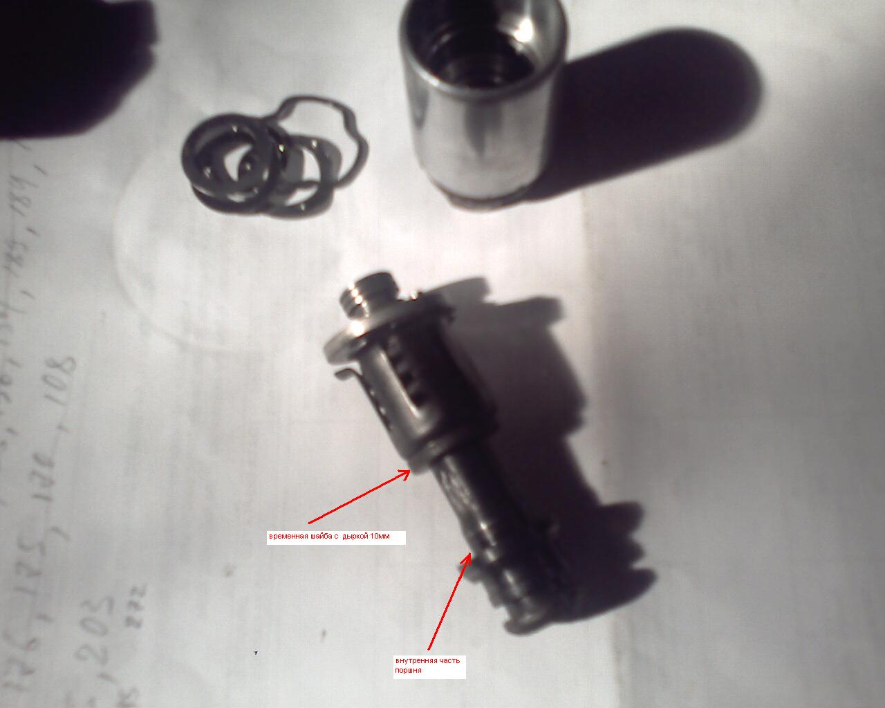 Хитрый механизм собираем и стягиваем, используя для этой цели извлечённую внутреннюю часть поршня (если у кого имеется гайка с такой резьбой- ещё лучше Very Happy ). Между этой "гайкой" и короной устанавливаем временную шайбу с дыркой 10мм. Стягиваем до того момента, когда маленькая шайба встанет заподлицо с лепестками короны- иначе стопор не встанет на своё место. Всё- смазываем хвост болта и уплотнительное кольцо смазкой(я ЦИАТИМ использовал), и суём на своё место.