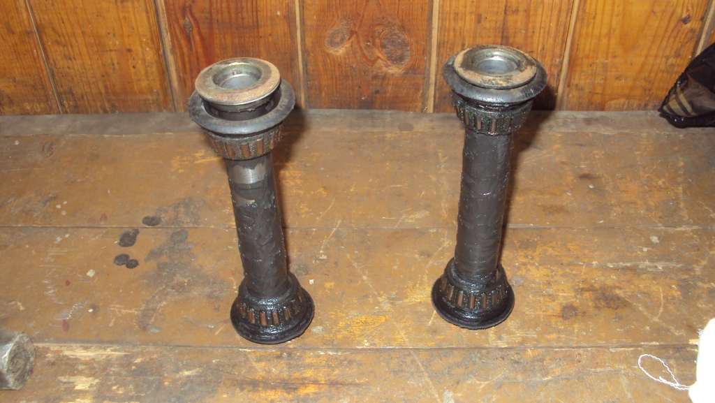 Сравнил детали ремкомплекта и свои старые. Сравнение получилось не в пользу ремкомплекта- мои старые стальные втулки точёные, а в ремкомплекте какие-то катанные, похожи на недоделанные водопроводные сгоны на 1/2 дюйма. Болты- старые точёные, с фасонной поверхностью под подшипники, в ремкомплекте же катанный, да ещё шаг резьбы по кой-то хрен 1.75мм. Ну и помимо внешнего вида- соединение старых втулок с болтами без радиального люфта, в новых- заметный люфт, предпосылка для завала колёс. Короче, оставил старые болты и втулки.