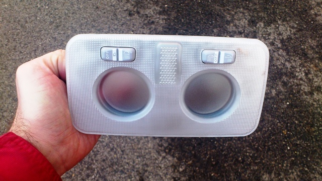 | Вид зверху. Стрілками вказані фіксатори. Металічні потрібно відігнути, щоб зняти світильник. Видно лампочки, якими освітлюється салон Нуово Добло. |
