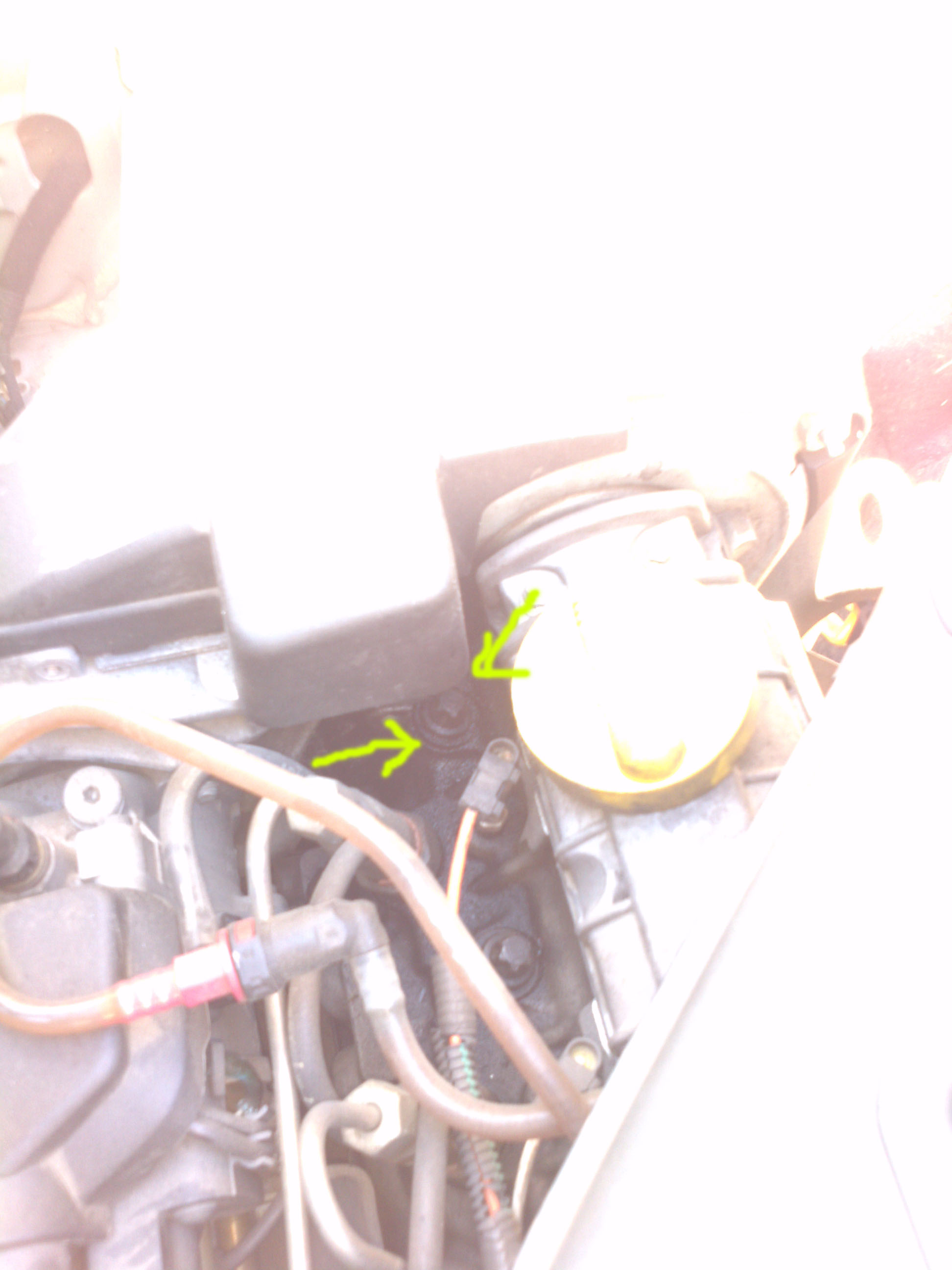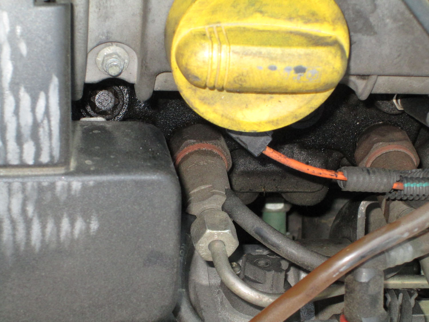 На двигуні біля якогось болтика поряд з форсункою було помічено мастило чи соляра, точно визначити важко ,але видно що протікає від тієї штуки яка вказана стрілкою, що то за штука така і в чому може бути причина, можливо там просто підтягнути треба або прокладка під тим болтом накрилась?