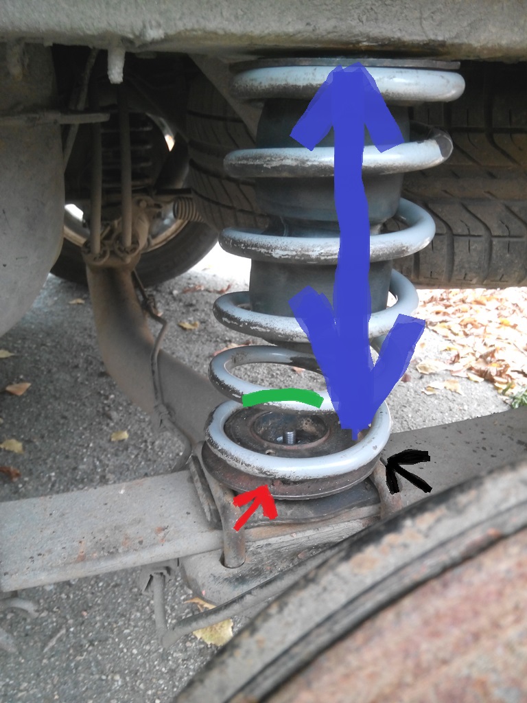 На моём рисунке (следующий пост) показано изначальное, неправильное положение пружины. Спиленым витком я ставил книзу. Там и вся проблема. На фото с цветными линиями зеленым отмечено продолжение пружины. При таком расположении в месте, где красная стрелка, её подрывает (видно на фото, что там она выше, чем в месте с черной стрелкой) и участок витка выскакивает наверх чашки с жутким звоно-грохотом при попадании в яму. При выезде из ямы она вщёлкивается на своё место с тем же звуком. Синяя жирная стрелка как раз показывает, куда приходится ось нагрузки при растяжении пружины на яме. Этого бы не было, если подобрать пружины, подходящие по высоте с завода. Заводской край витка навит "в ноль". Она бы лучше прилегала к чашке. Но "я её слепила из того, что было" .