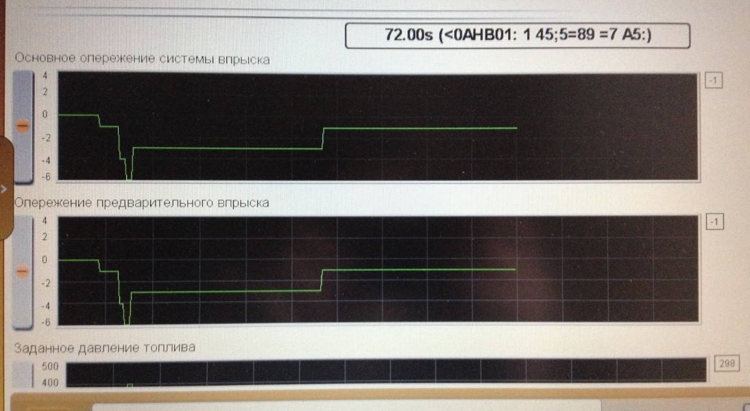 По графику,динамика подьёма давления топлива не плохая,линия почти вертикальная.Не понятно конечно масштаб,за сколько времени оно поднялось до 170-200 бар для разрешения открытия форсунок.Немного повышенна цыкловая подача,но двигатель же холодный,поэтому так и должно быть.Я так понял график записан на протяжении 72 сек.Так по графикам ничего криминального нет.