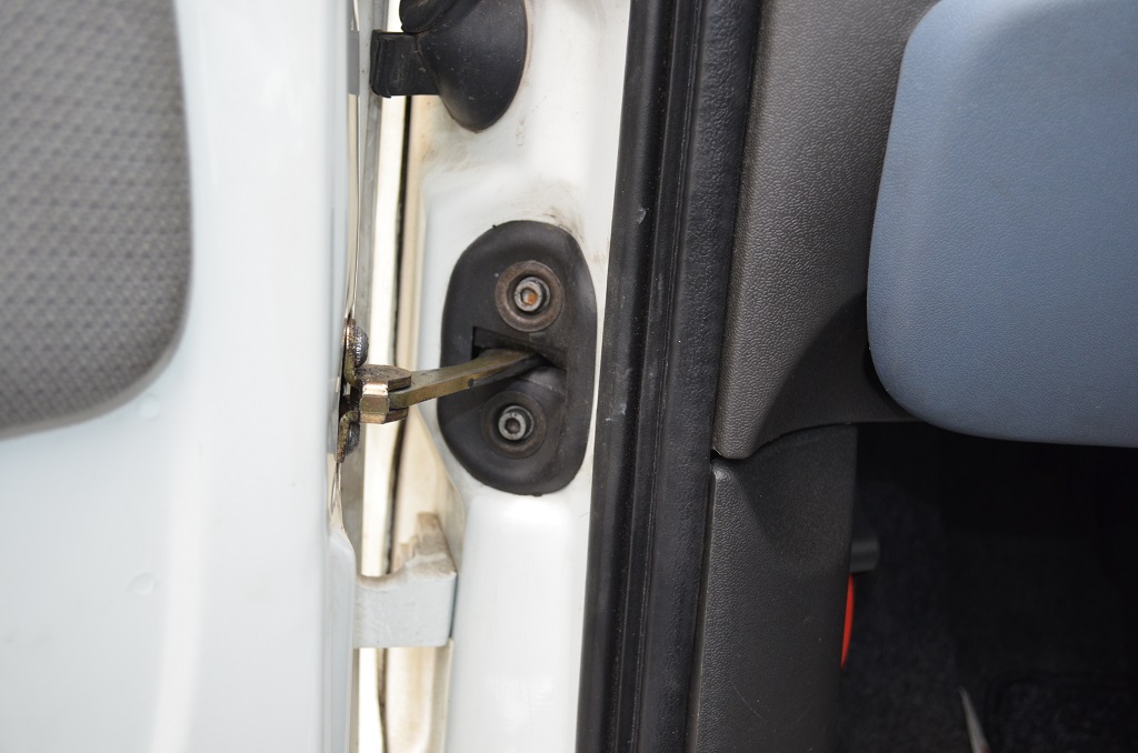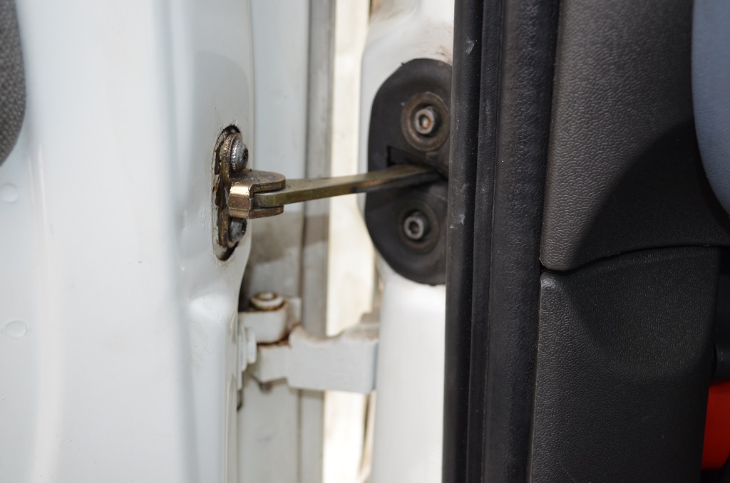 8. Откручиваем ограничитель двери от самой двери и от стойки автомобиля и аккуратно через техническое отверстие вынимаем ( самому очень неудобно и трудно, мастера делали эту процедуру вдвоём один подавал второй вынимал).