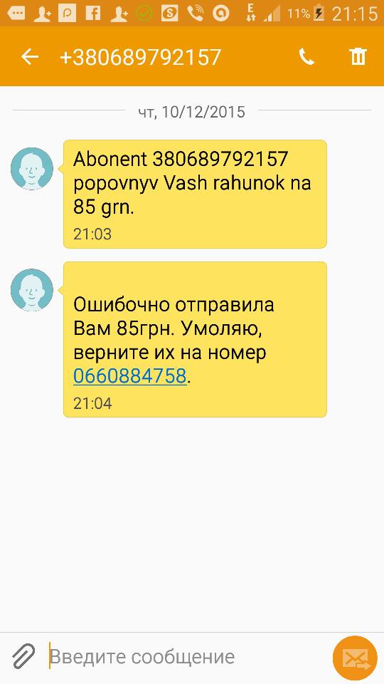 дуже рідко бабушкі читають смс (тих кого язнаю)періожичго чизу тел від смс і решти рекламного хламу а реально було якись студент перепутав замість 096 вкатав 097 і поповнив мені рахунок