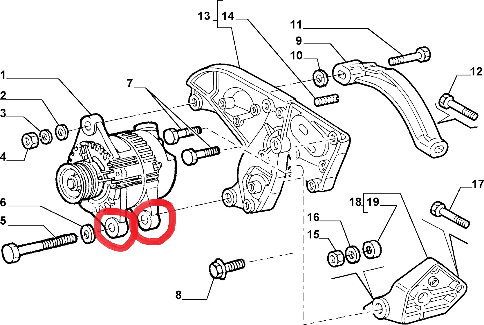 Вообще я собираю так: сначала уши генератора вставляю в ответную часть пластины № 13, затем вставляю болт № 11 с шайбой № 10, наживляю гайку № 4. Затем вставляю и наживляю болт № 5 и только потом Болт № 12. Затягиваю всё шо есть дури, но трубами-удлинителями не пользуюсь. Да там и не увернуться с трубами.
