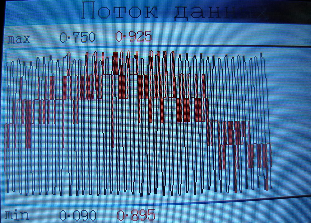 - Показания снимаюцца в реальном времени в режыме "графопостроителя", графики строятся на показаниях напряжений двух лямбд. Одна рисуецца чёрным, вторая красным.