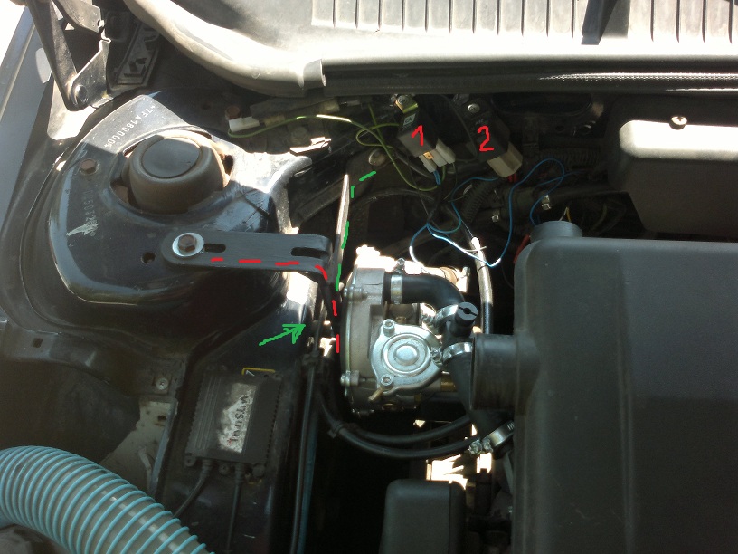 | Красным отмечено то, что сделали установщики, зеленое - то, что я сам доваривал, чтоб усилить. Реле:1 отключает форсунку, 2 - выключает бензонасос. |