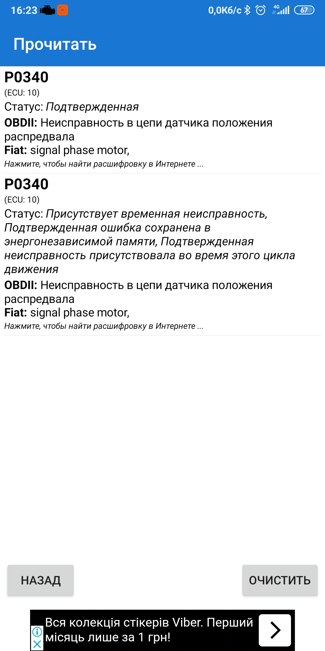І друга - при заводці загорівся чек. Машина відразу почала тупити, не крутиться більше 3000 обертів. Код помилки сканер ОБД показав такий - P0340. Фото прикріплюю.