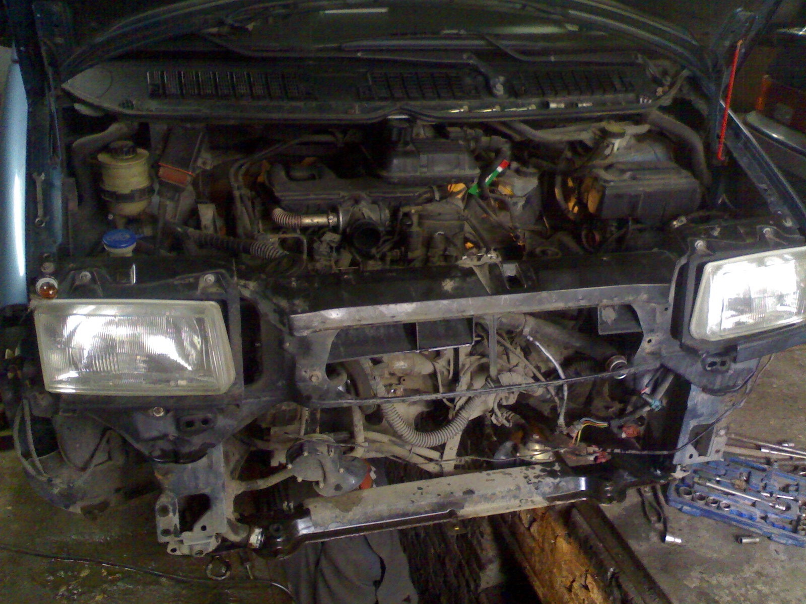 Знімав:2 піввісі, вентилятор, кожух вентилятора, верхній шланг з радіатора, розпорку ланжирон- підрамнік, решта видно на фото.