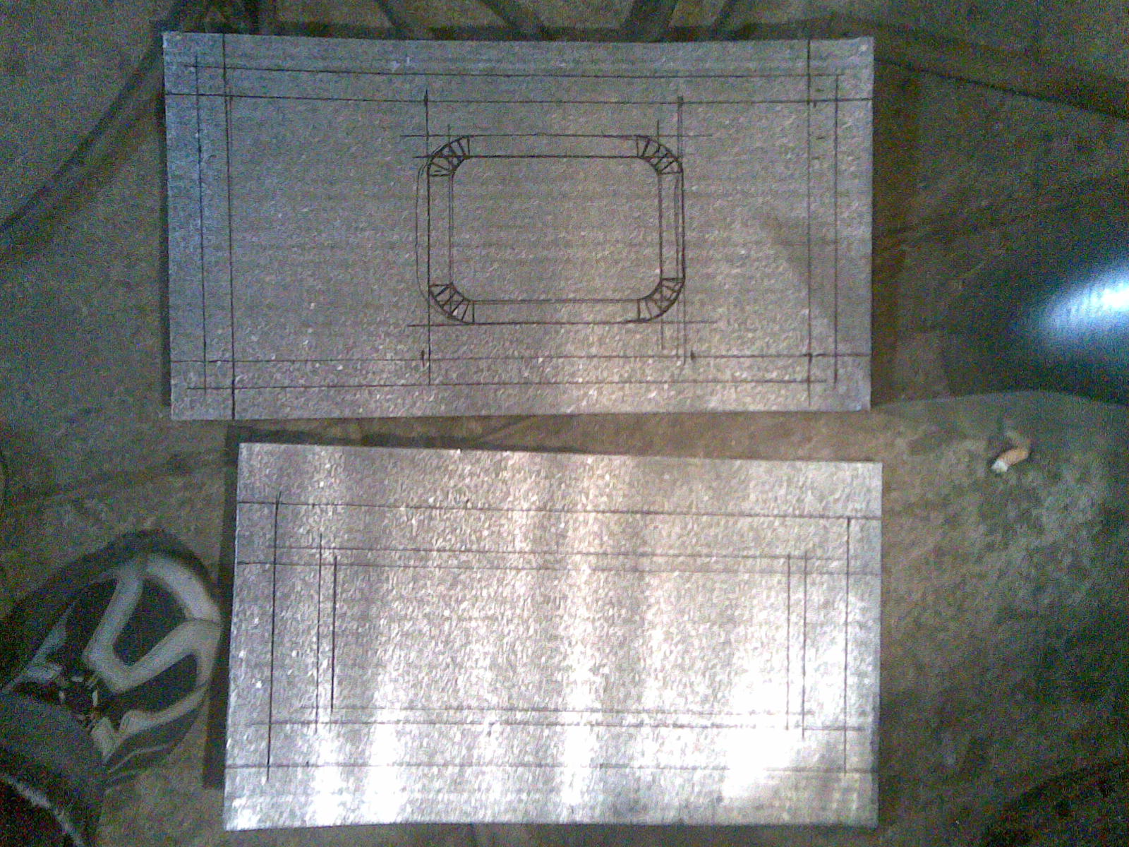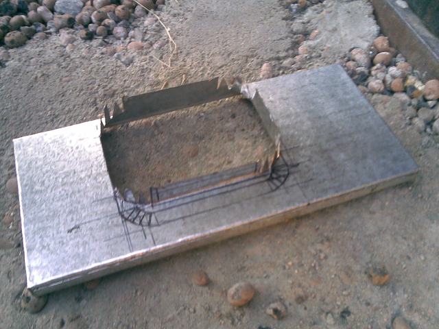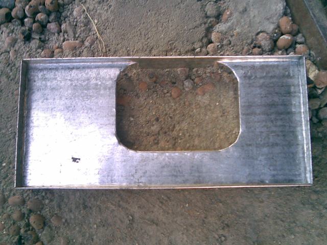 | Раскройка оцинкованного листа. Размеры отверстия: просто накладываем и прижимаем на него кусок картона |