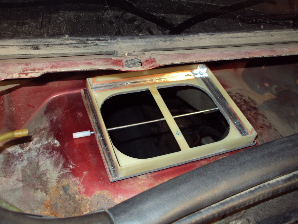 Сподобился, наконец, себе сделать. Спаял кассету из двусторонне-фольгиворанного текстолита под ВАЗовский фильтр, обрезанный по длине. Две стенки кассеты выполнены "Т"-образной формы. "Уши" пропущены сквозь прорези в основании, и служат для крепления конструкции к отбортовке шахты. Затруднение вызвало изготовление крепёжных отверстий в отбортовке- слишком мало места, и с дрелью не развернёшся. Поэтому, сделал из подручной железки примитивный дырокол. Боёк сделал из сталистой спицы 3мм, от подвесного потолка. Рабочий торец бойка слегка заточил под скос. При помощи раздвижных пассатижей отверстия прокусились в один миг, получилось идеально. Снизу основания припаяны два центрирующих ограничителя, сделанных из автомобильных клемм. Для герметизации стыка кассеты и отбортовки наклеена самоклеящаяся шумка, толщиной 5мм. Кассета крепится при помощи спицы от моторчика замка двери, на которой с обеих сторон нарезал резьбу 3мм и накрутил капроновые стойки от радиоаппаратуры. Для придания жёсткости обрезанной части фильтра, между волнами вложена пластина из текстолита.