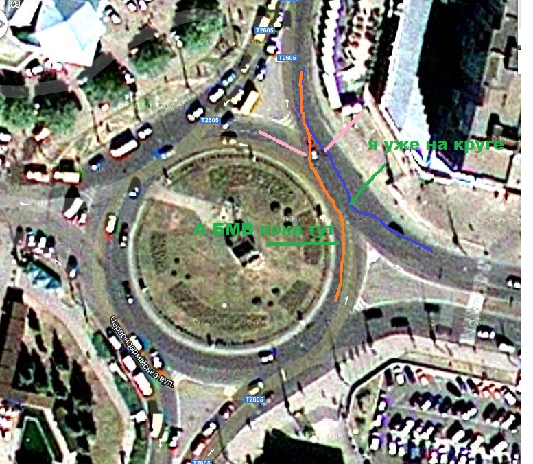 правильные варианты движения в данной ситуации: за 9-кой или по кругу. все остальное - создание аварийной ситуации. как не крути БМВ тут прав.
