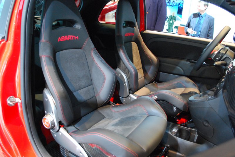 Салон Abarth 695 Tributo Ferrari поражает. Ведь здесь стоят шикарные спортивные кресла (они на 10 кг легче стандартных), новый руль с заранее отмеченным «нулем», стильная доска приборов, есть вставки из карбона, стальные накладки на педалях, алюминиевая площадка под ногами водителя! От маленького Fiat 500 такого просто не ожидаешь.