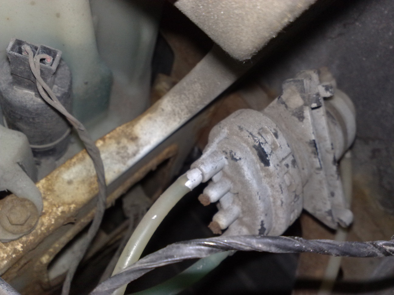 Но самое интересное, что левая фара совсем не регулируется.... При сравнении фар засек, что на левой фаре стоит сверху какая-то фигня (первое фото) на втором фото вид сзади, это подключено к байде с третьей фотки и по шлангу (проводу?) уходит кудато под днище. Ямы нет посмотреть детальней. От третьей байды идет еще один шланг/провод к правой фаре, ног там к фаре оно не закреплено.