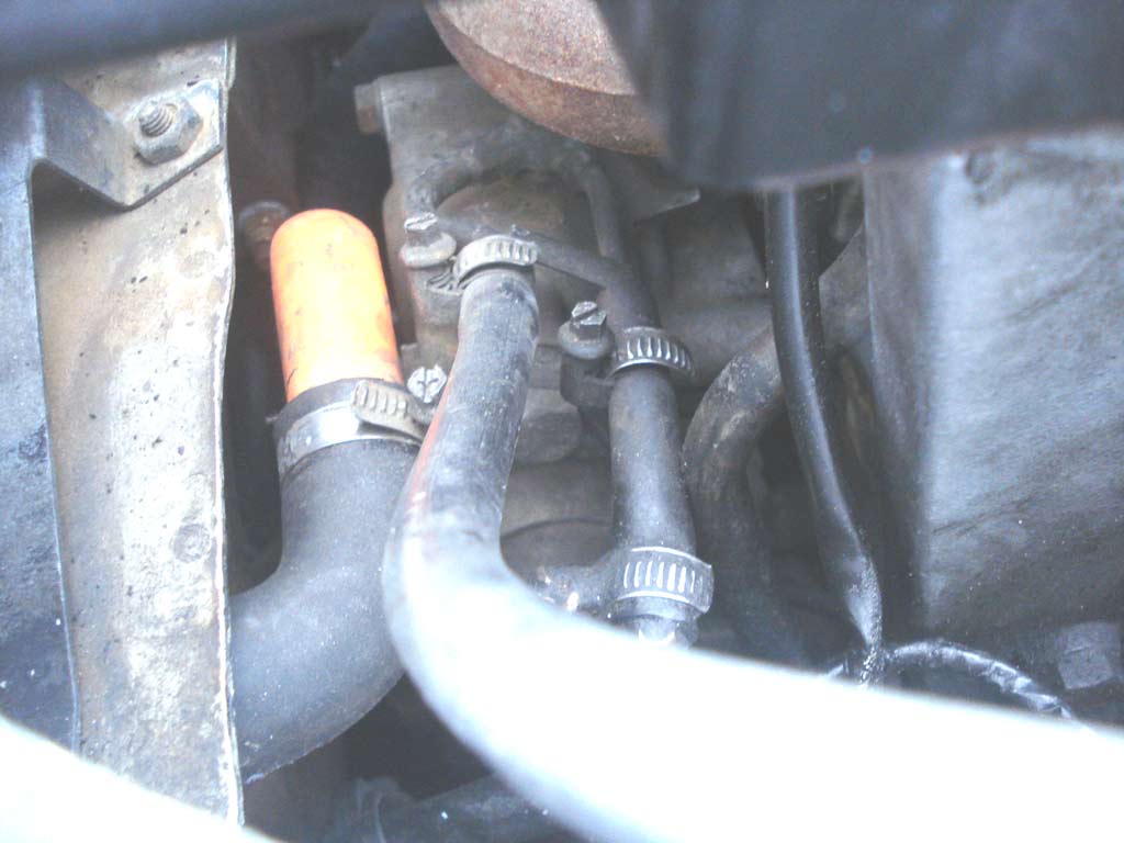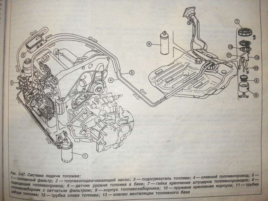 Ниже фотки и схема с книги. На схеме изображён подогреватель с оттоком (сбоку), у меня данного оттока нет, в том месте крепёж к кузову. Подвод и тройник приподнят вверх схематически и стрелкой указано куда он садится.