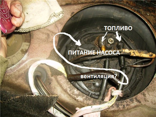 Какая-то куча хомутов, все залито бензином. На дне колодца для насоса вообще стоит его целая лужица. Начал вытирать все это дело. Разобрался что рядом у меня еще указатель уровня топлива, проводки на насос. Короче потихоньку изучил все (вдыхая пары бенза ).