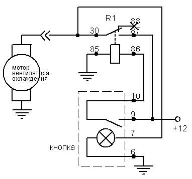 Сегодня был выходной, и решил довести все до ума. Замыканием контактов на датчике вентелятор не включался, следовательно датчик рабочий, что меня сильно порадовало. Далее искать причину поломки штатной схемы нестал, поскольку проводов немерено, да и колхоз в проводке присутствует. подключал карлсона от аккумулятора через реле по схеме привиденной ниже. Но кантакты которые выходят на кнопку (по схеме) подключил к датчику включения вентелятора. после того как все было подключено, завел машину и немного покатался, но при обычной езде выше 70 градусов не грелась. Приехав дамой оставил машину на холостом ходу и немного погазовав температура поднялась до 90 градасов. И вуаля на 90 градасах карлсон включился.