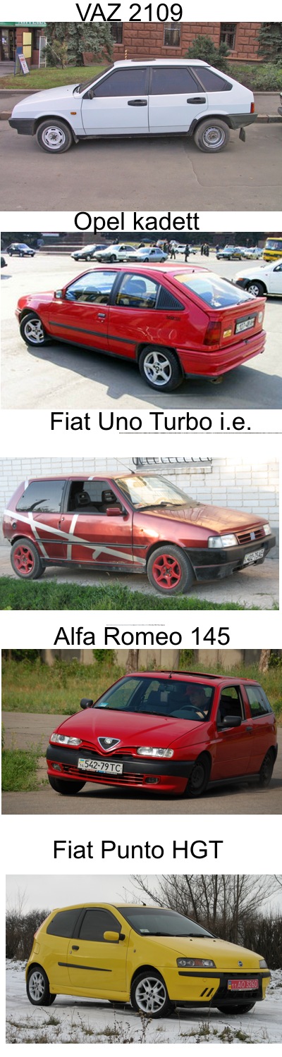 К сожалению фотки не сохранились ВАЗ-2107 , РАФ , OPEL-KADETT , FIAT TIPO .