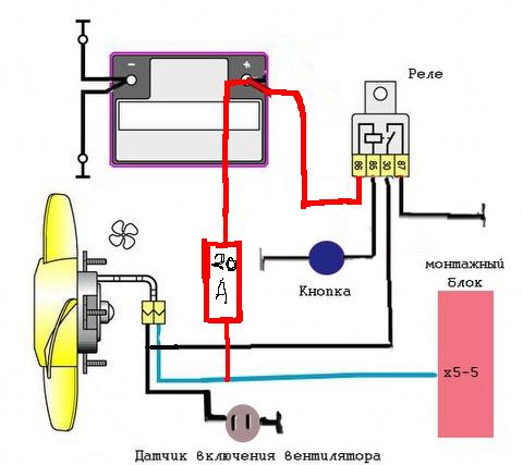 По схеме... провод (черный) от реле к вентилятору должен быть подключен в параллель к датчику со стороны вентилятора (к черному, а не к голубому???). Пред в 20А на реле не нужен. Но нужно обеспечить подачу +12 от блока предохранителей (или от АКБ через пред 20А) на вентилятор (голубой провод по схеме???).