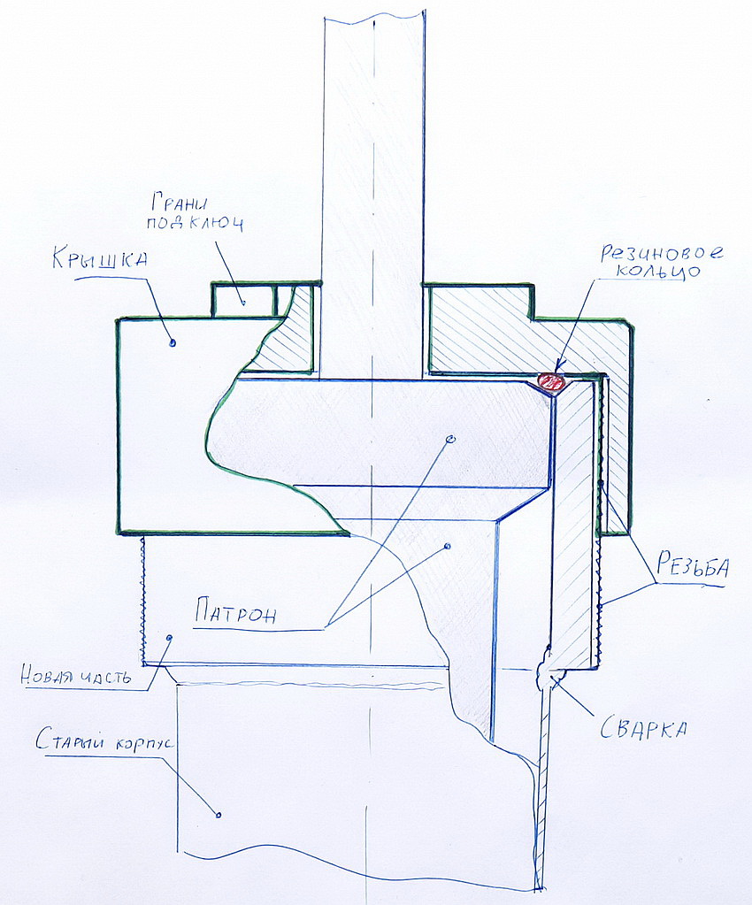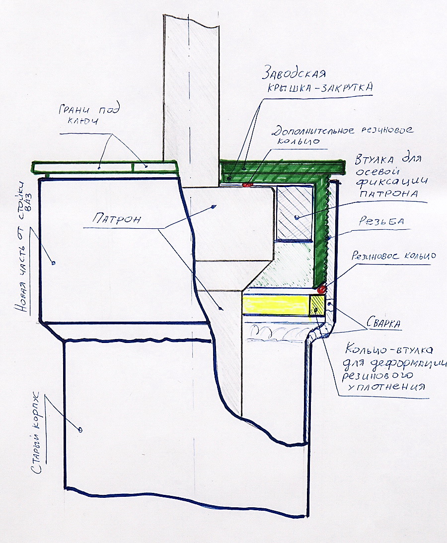 2. Второй вариант крышки- использовать заводские детали( рис2). Для этого верхняя резьбовая часть корпуса берется от старых корпусов амортизаторных стоек ваз 09-10, она с внутренней резьбой. Крышка -закрутка берется современная промышленная, которая под гаечный ключ. Такие крышки продаются разных видов под определённую марку заправленных маслом патронов, выберите наиболее универсальную. С герметизацией тут посложнее, зато такой принцип практически под любой вид патронов. Вымеряется высота в сборе с крышкой и резьбовая часть приваривается. Внутрь корпуса вытачивается и приваривается ограничительное кольцо, которое необходимо для деформации резинового уплотнения. Само кольцо сидит не герметично относительно корпуса, фиксируется сваркой через 3 радиальных сквозных отверстия в корпусе, которые в процессе фиксации завариваются. Необходима точная его установка, без перекоса. На рисунке оно получилось слишком маленьким по высоте.