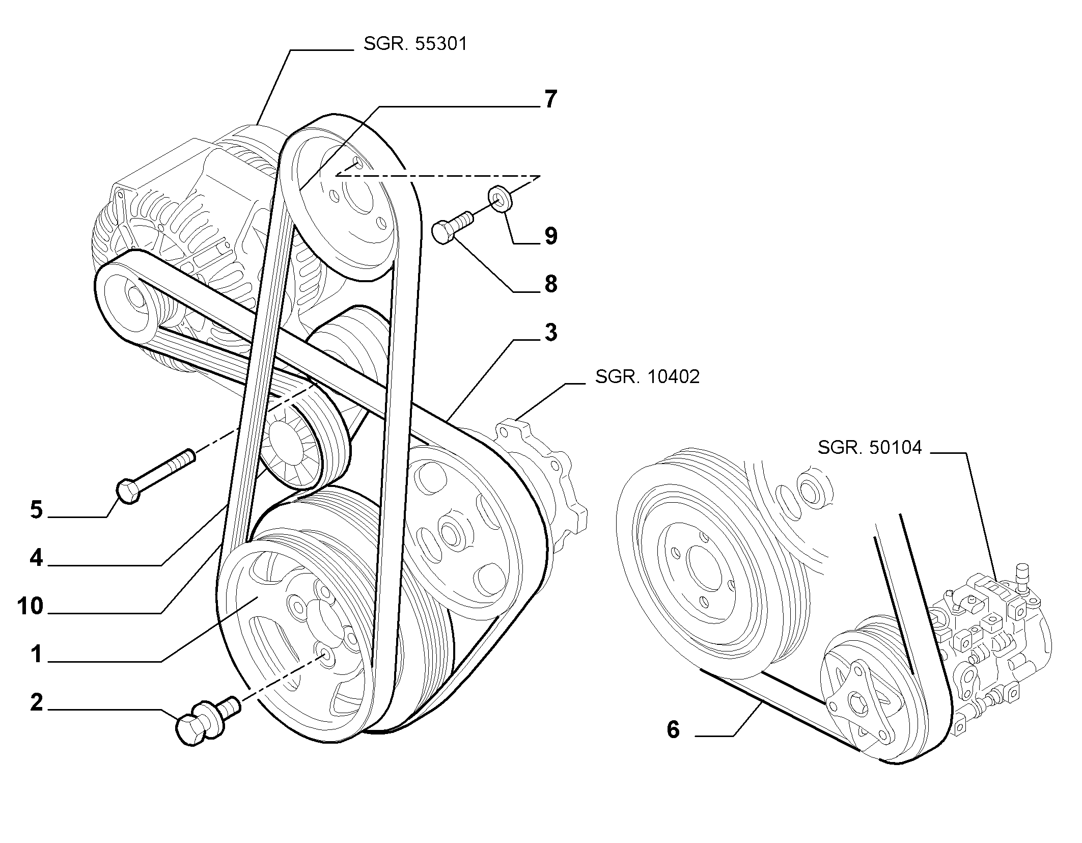 В прошлуюю среду на скорости 120 слетел ремень генератора(на рис. №3, он же помпы)... Слегка взбударажило но терпимо.. Всё изза подклинивавшего подшипника (ролика №4) натяжителя. Поменял натяжитель всборе (dayco, 350 грн.), ремень (dayco, 120 грн) проехал всего 250 км и сегодня в 4.30 утра в дороге лопнул болт крепления натяжителя №5 и ремень.№3....хз теперь как его высвеливать, доступа без снятия двигателя нет к креплению натяжителя. И ролик пробежавший по асфальту покоцаный, походу опять под замену Shocked Evil or Very Mad может кто из бывалых что подскажет? Idea