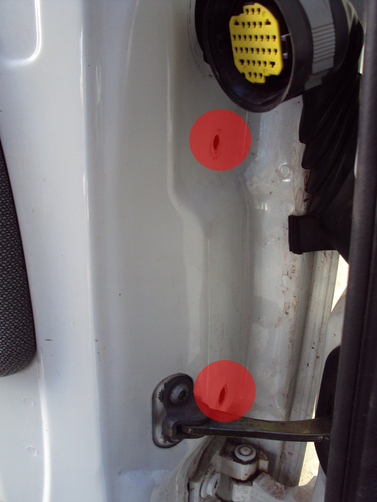 Разобрал дверку, так как там не было динамиков. которые массажируют "пятую" точку. Оказалось, что там и проводов нету. Приступил к разборке фишки в дверях. Чтобы её снять надо отвинтить 2 болта с торца двери (на фото красным) и снять направляющую стеклоподъёмника. Но и там у меня нету никаких выходов на акустику, а только на ЦЗ и стеклоподьёмник. Как сделать, кто сталкивался с такой проблеммой?