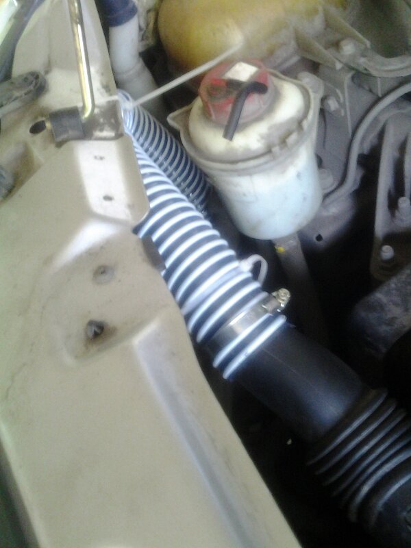 Пошёл я на рынок, купил гофру (ту, что код раковины ставится, крепкая с проволокой внутри). Гофру нацепил на штатный патрубок от возд. фильтра, второй конец вывел мимо бачка омывателя и вниз, ближе к вент. отверстию рядом с противотуманкой (правой). В конце гофры примастырил крест вину с раковины (в которую вода уходит) - чтоб ничем не засосало. Всю эту конструкцию прикрутил хомутами и зажимами - сидит плотно.