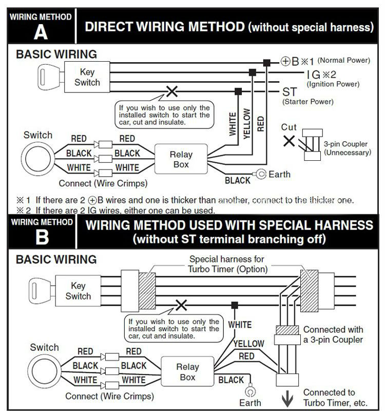 Что бы разобраться попробуй подать на красный провод +12В, а на черный -12В. Поробуй разобраться как управляет кнопка выходами, посмотри что происходит на желтом и белом проводах, в какой момент уде появляется. Сразу должно появиться на желтом (зажигание включается), а потом на белом (включение стартера).