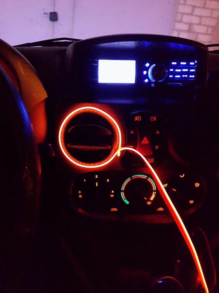 Есть масса цветов, каждый может подобрать себе по вкусу. Он бывает разной толщины, от 0,9мм. Но главное, есть не круглого сечения, а кругляк со "шлейфом" как бы, чтобы этот шлейф можно было всовывать в стыки пластика торпеды, к примеру. Как раз, "автоколхоз вариант" . Я выбрал оранжевый, понятно почему. По факту разным цветом он светится за счет окраса оболочки. Сама светящаяся жила светит белым с голубизной. По глазам не бьет. Мне очень нравится, всем кому фастаюсь - тоже . Его можно резать на любой длины кусочки и спаивать, правда работать приходится "ювелирно" (смотрим видосы в ютюбе). Пищащий блочек подключил к лампочке подсветки печки, там же внутри его и расположил. Слышно только при заглушеном движке в абсолютной тишине. Собсна фоты.