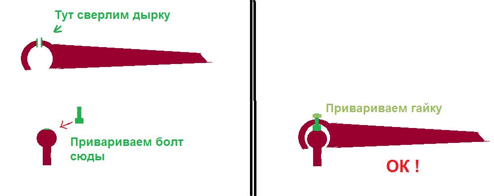 6. Заводим изготовленную пластину вырезом под шарнир и прикрепляем ее к штанге любым доступным способом (заклепки, саморезы, болт-гайка). Одно отвестие на штаге уже имеется!
