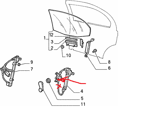 опустили стекло (заднее, правое) а поднять не получилось. снял обшивку. начал рыть . нашёл. на рисунке по стрелке. деталь обжата в трёх точках. разжал. внутри цилиндрический, пластмассовый вкладыш с резьбой. на него наматывается тросик при опускании и подымании. вот на этом вкладыше , тросик посатался и перетерся .
