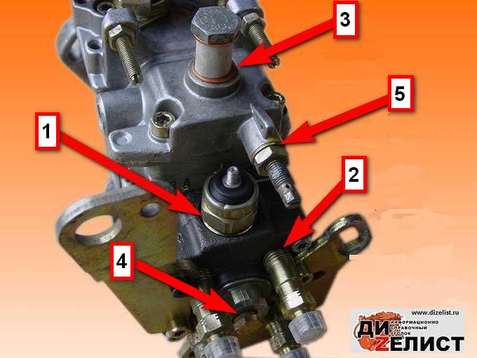 Туда может стекать и оттуда где ты думаешь, и из-под клапана отсечки топлива (1), и из-под клапана выхода на форсунку (2), и из-под "обратки" (3), и из-под заглушки контрольного отверствия (4), и из-под регулировочного винта (5) (вообще невероятно)... ищи