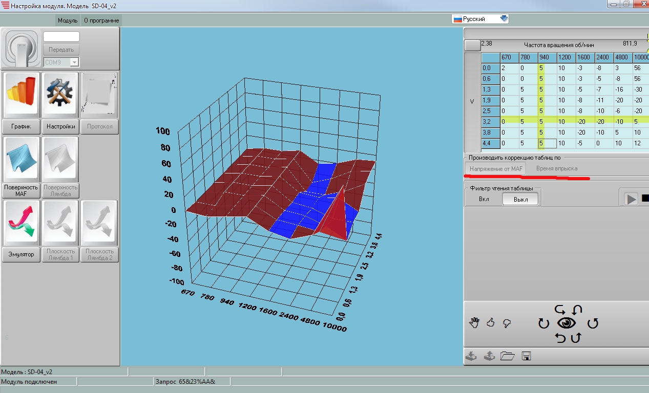 Сегодня попробовал поиграться небольшой маленькой коррекцией. Для начала в диапазоне холостых и запуска. Ниже для любопытства скриншотик как это выглядело. Это не окончательная плоскость разумеется. Конечным итогом стала некая коррекция запуска, двигатель стал гораздо легче подхвачивать при старте.