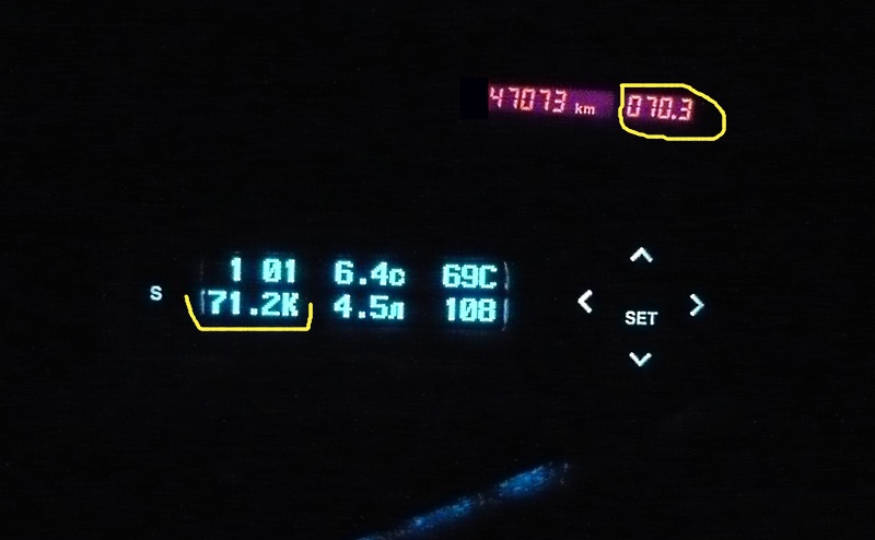 На этот раз заснял показания обоих пробегов, на приборке и на компьютере, для большего верия в натуральность показаний. Эти показания чуть чуть отличаются, потому что сначала сбросил компик, затем пришлось отвлечься на дорожную ситуацию, лишь после которой сбросил на приборке, поэтому разница в 1 клм. есть.