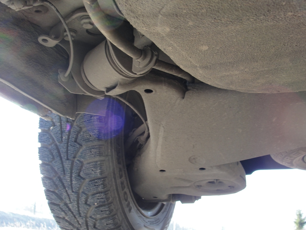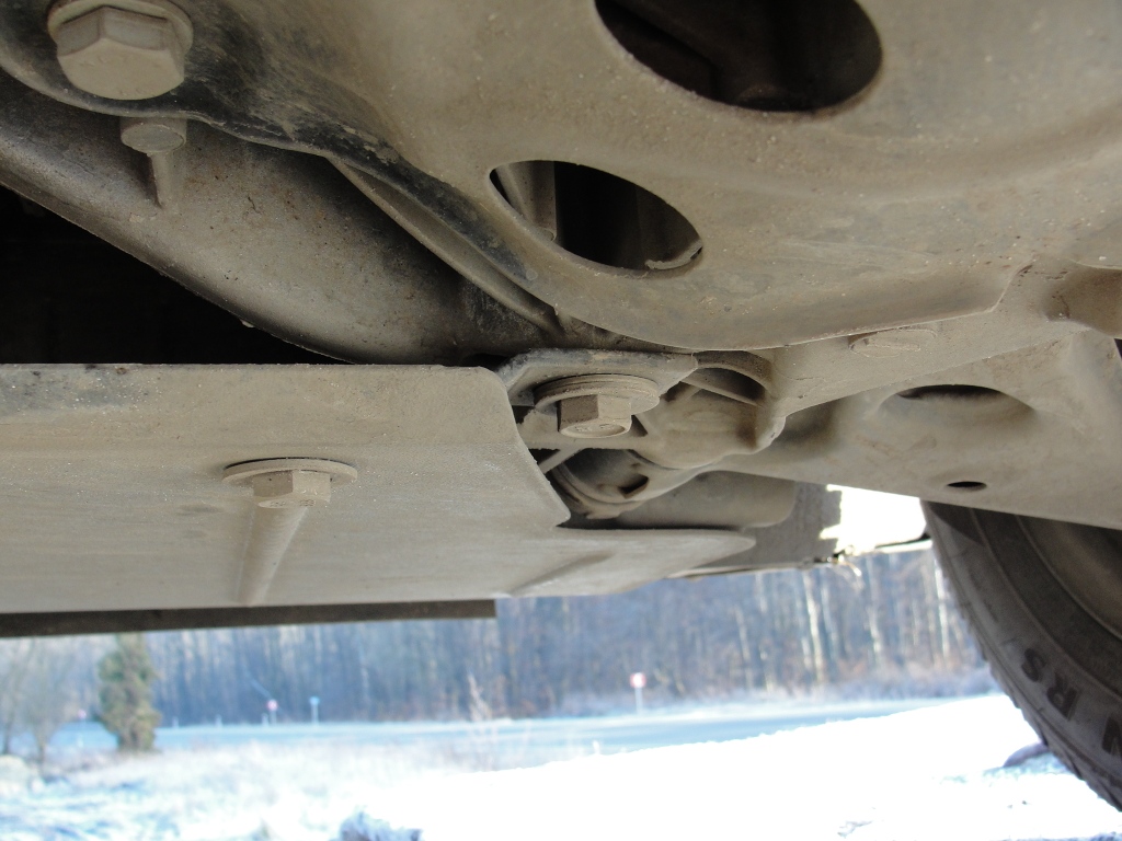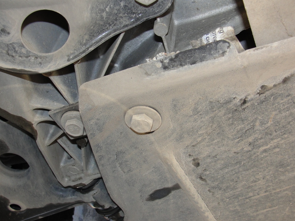 Спереду захист кріпиться трьома болтами до пласмасової планки, але вона достатньо товста щоб його утримувати. Ззаді два болта. Захист закриває все і в тому числі коропку передач.