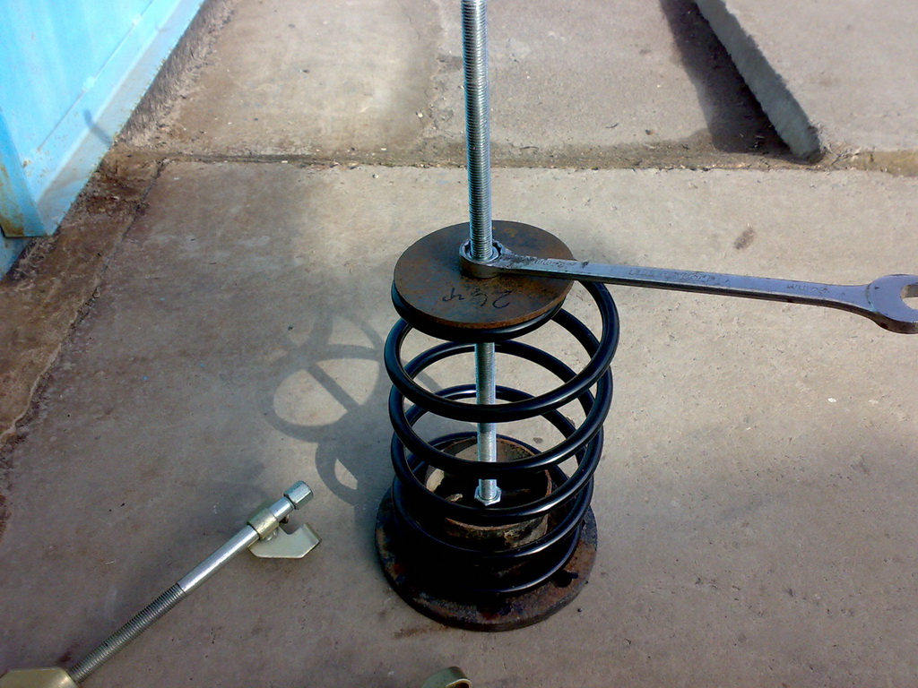 Только 3 дня назад делал процедуру. Кста стяжки у Dinа взял, точ такие как на правом рис. Не плохо было бы стягивать тремя, но обошёлся двумя. Тут главное, что б не съезжали в момент стяжки пружины и стояли точно паралельно А при установки действительно должен присудствовать помошник который наживит гровер и гайку в тот момент когда ты натягививаешь собственным весом.