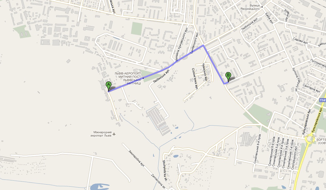 Від єропорта просто до великого перехрестя зі світлофором, на ньому на право, на наступному світлофорі наліво.