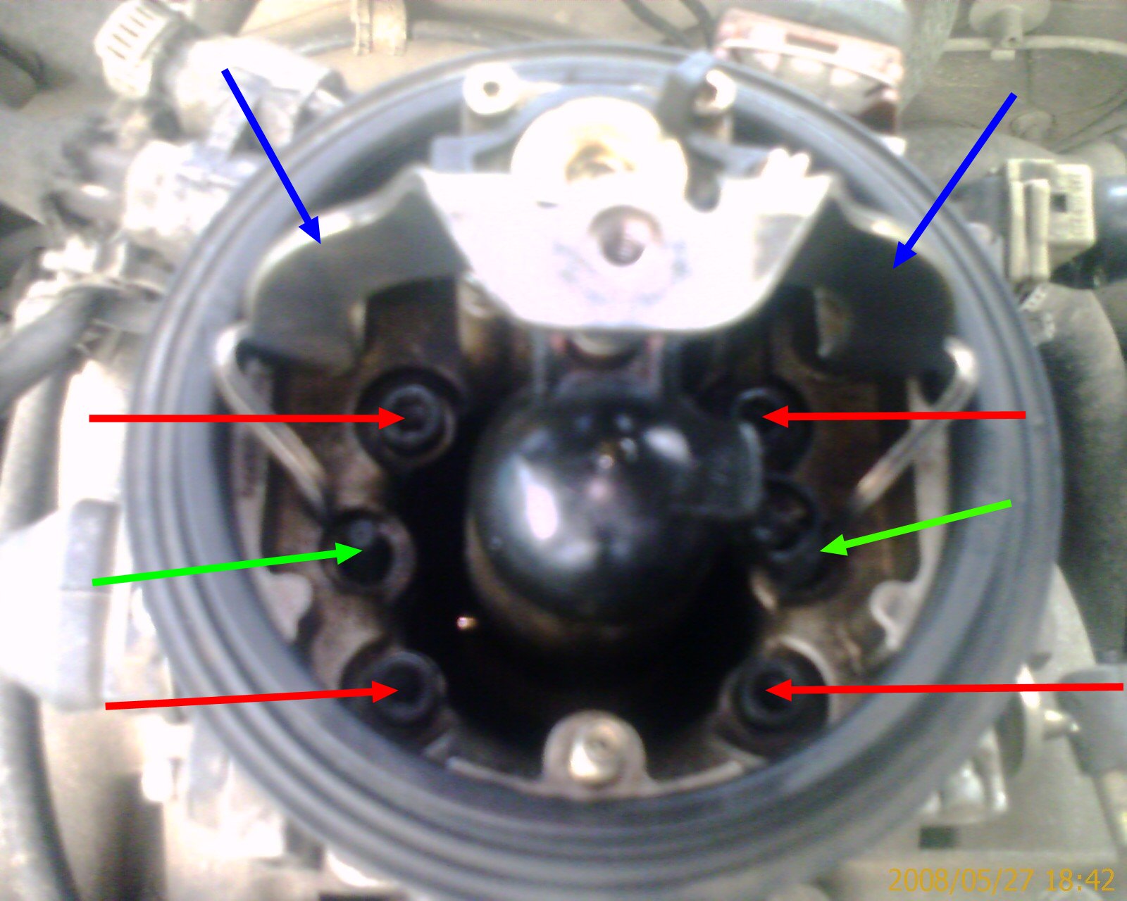 - Здесь откручиваешь две гайки трубкой на 10 и снимаешь держатель воздушного фильтра - Здесь выкручиваешь четыре болта шестигранником - Здесь аккуратно поджимаешь пластмассовые усики и снимашь голову моника
