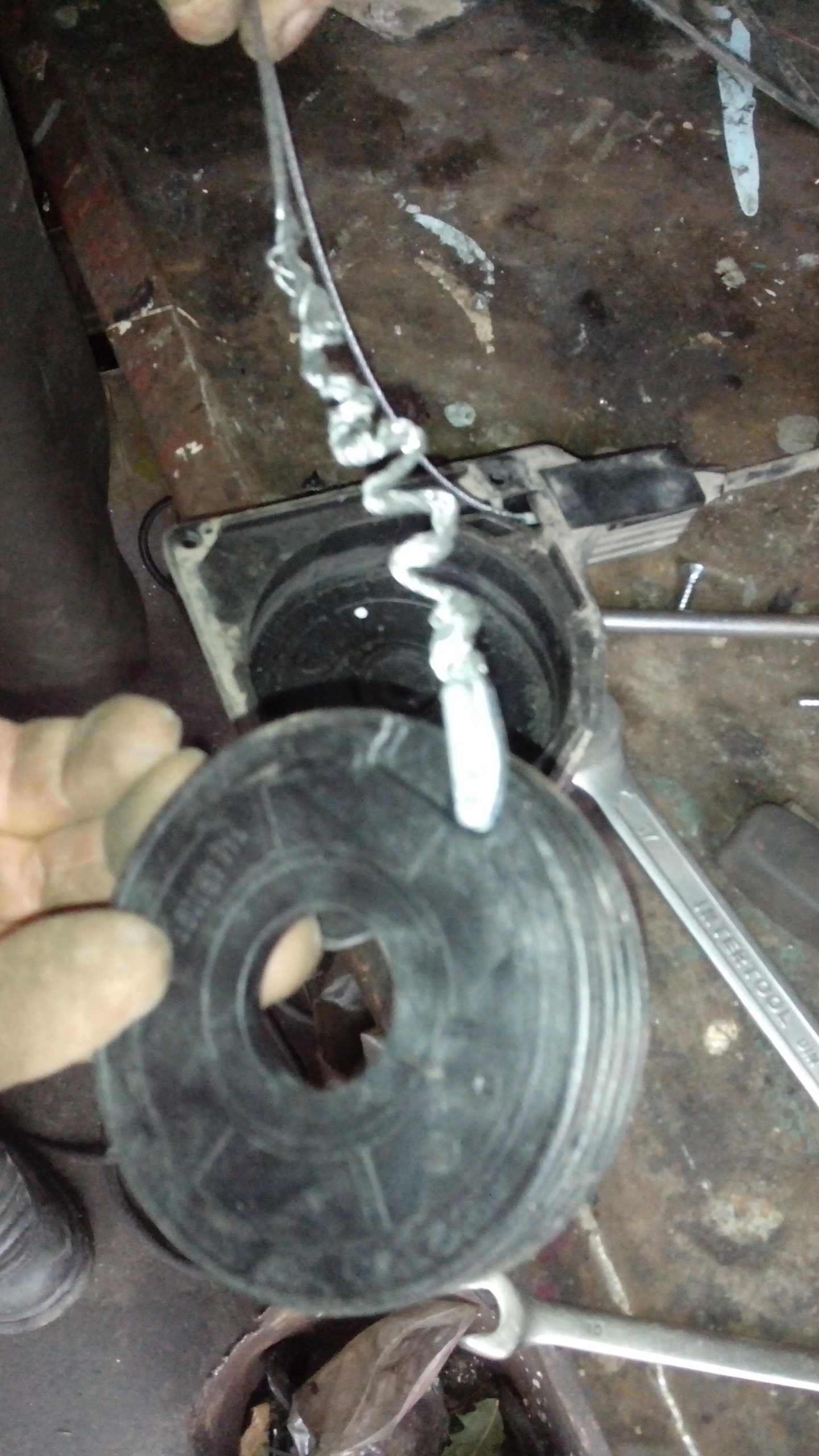 Отрубил трос, который запутался (до 10 см). Трос - не проблема - диаметр 2 мм на любом хоз. рынке, а вот с концевиками сложнее, я приварил к шпильке (5 мм) трубку(если не ошибаюсь, то тормозную) и расклепал в ней трос. На фото видно. Все получилось - но в следующий раз ставить запаску буду только с кем-то (чтоб тянули за трос).