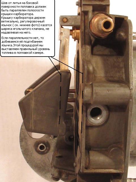 На Солексе надо перевернуть крышку вверх ногами и посмотреть на паралельность поплавка и крышки.