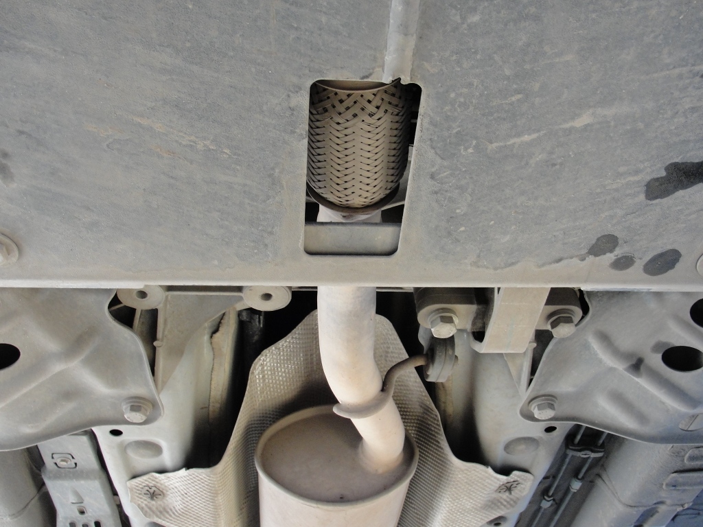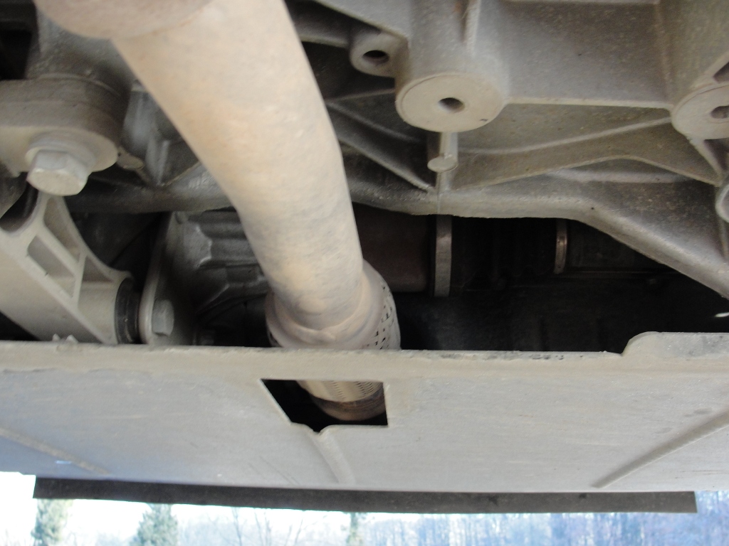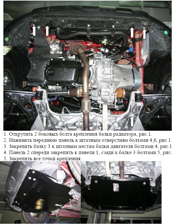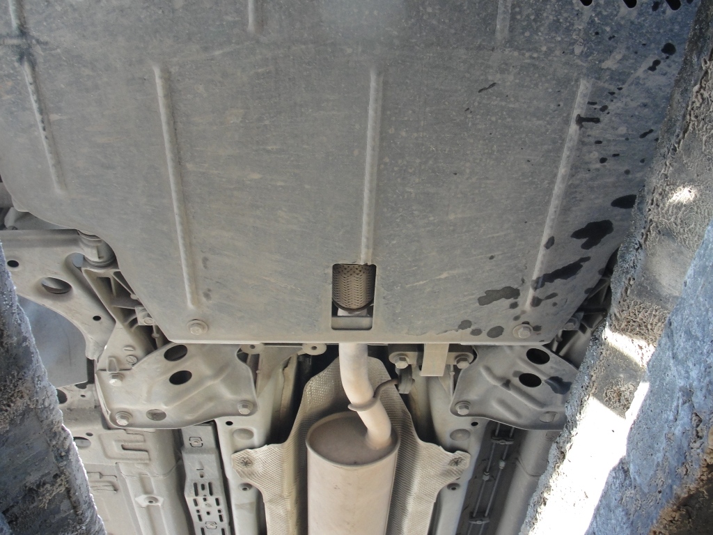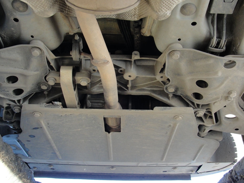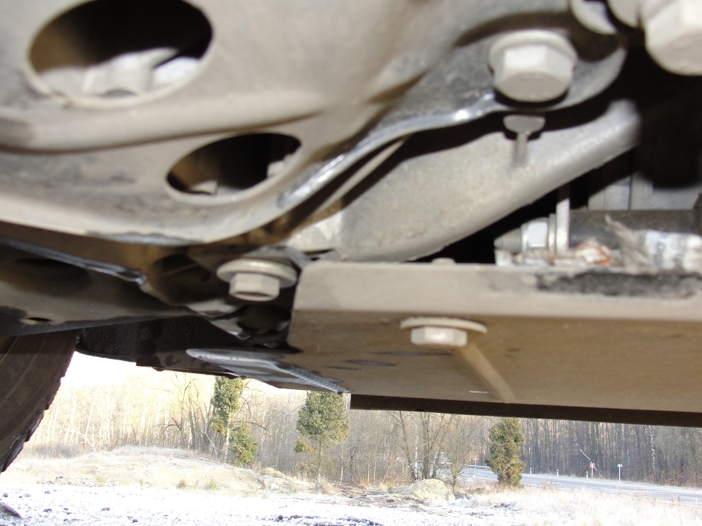 Спереду захист кріпиться трьома болтами до пласмасової планки, але вона достатньо товста щоб його утримувати. Ззаді два болта. Захист закриває все і в тому числі коропку передач.
