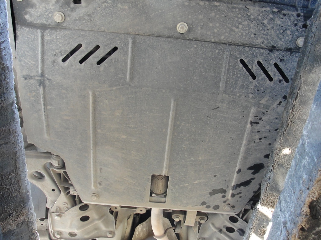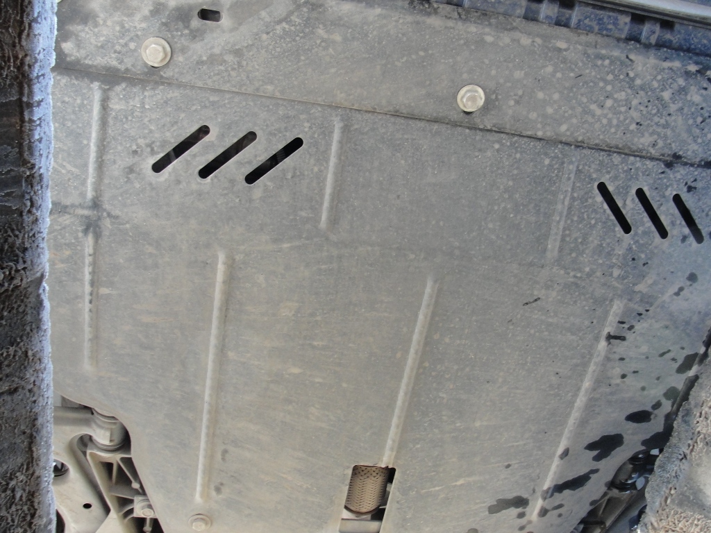 Спереду захист кріпиться трьома болтами до пласмасової планки, але вона достатньо товста щоб його утримувати. Ззаді два болта. Захист закриває все і в тому числі коропку передач. |