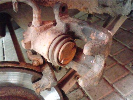 Подклинивал передний левый супорт,разобрал посмотреть.Сверху пильник целый.Нехитрым приспособлением цилиндр упоплялся.