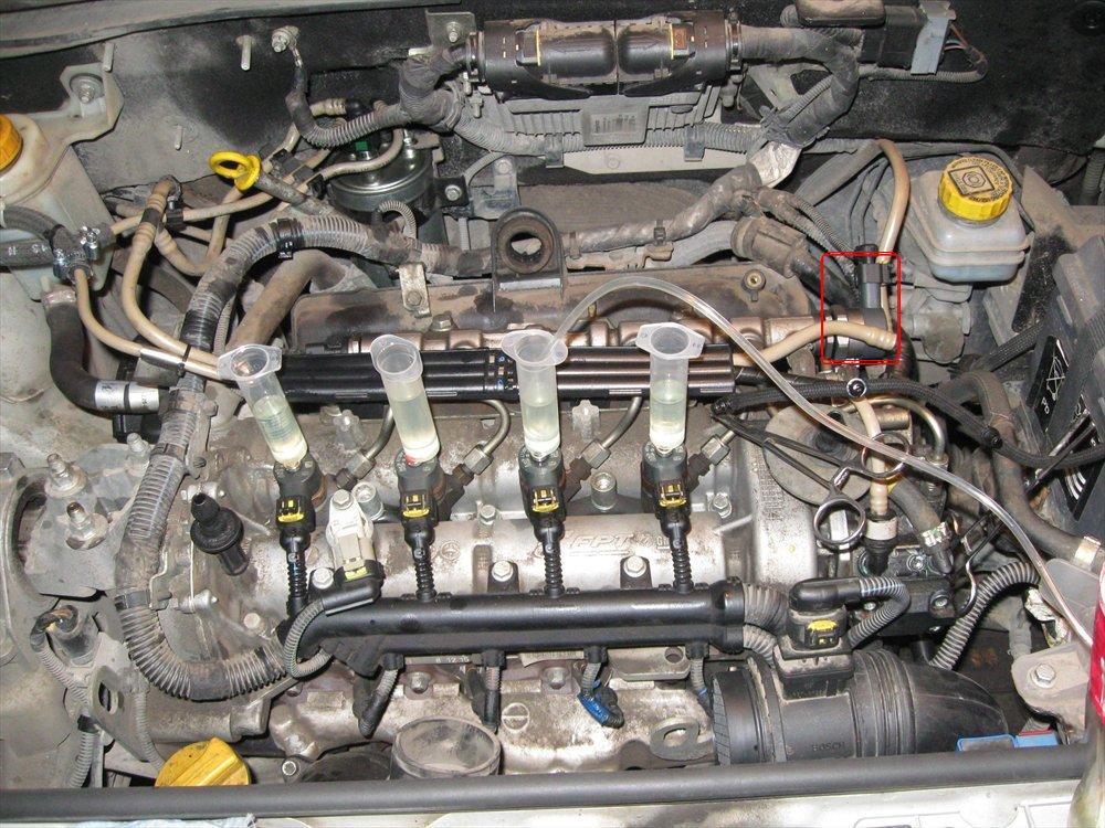 На фото обведен красным квадратом. На улице уже тепло поэтому температура двигателя уже мало влияет на гидроплотность топлива. Можно так-же проделать тест на слив форсунок как на фото. При отключеном питании форсунок после 10 сек. кручения стартера топливо не должно подняться выше штуцерка шприца. При работе у меня набежало то что на фото за 2мин 40сек холостого хода.