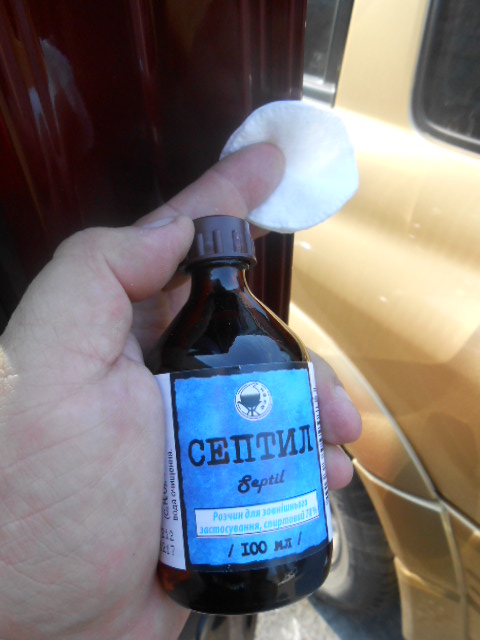Перед поклейкой обязательно отмыть грязь и пыль на месте приклеивания уплотнителя (слелал это влажной салфеткой), а затем обезжирить место и сам уплотнитель, который собрался клеить. Сделал это при помощи продающегося в аптеке 73% спирта, стоимостью 9.50 грн. и ушных дисков...