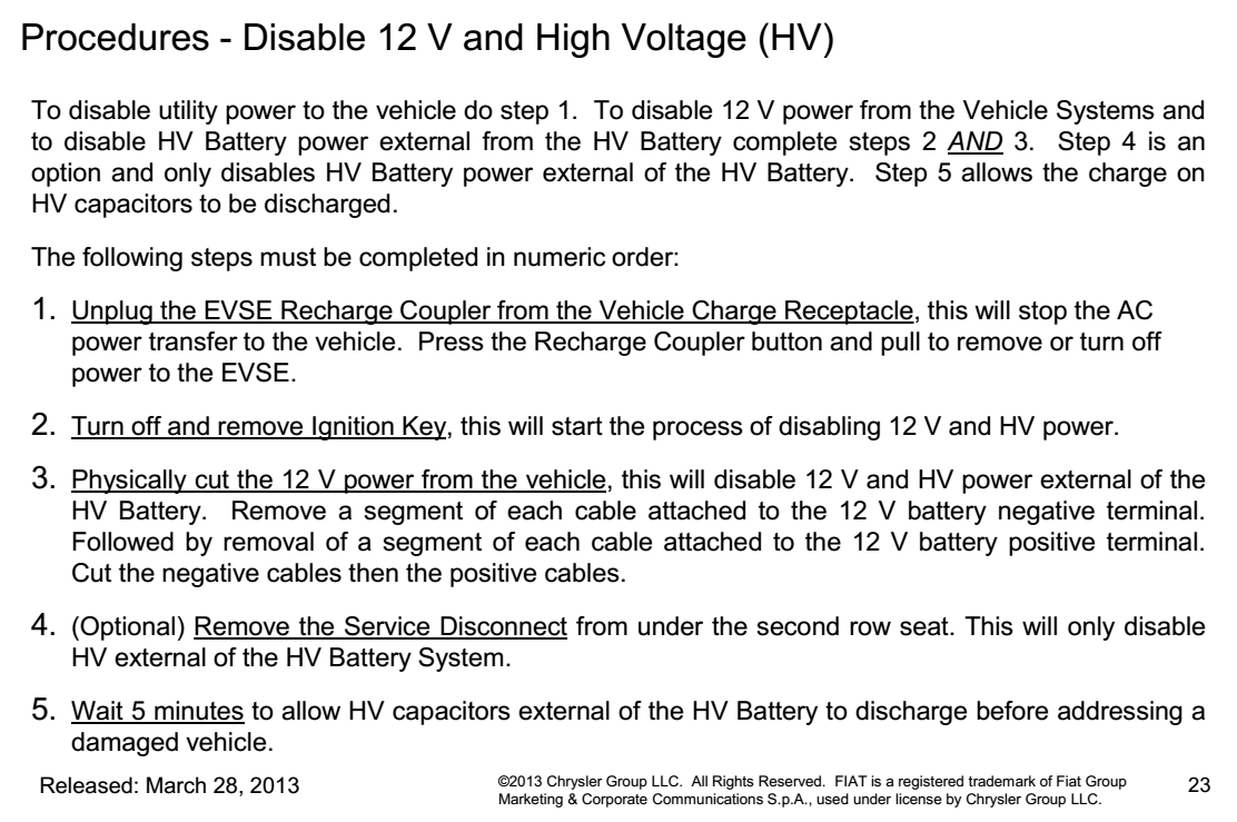 To disable utility power to the vehicle do step 1. To disable 12 V power from the Vehicle Systems and to disable HV Battery power external from the HV Battery complete steps 2 AND 3. Step 4 is an option and only disables HV Battery power external of the HV Battery. Step 5 allows the charge on HV capacitors to be discharged.
