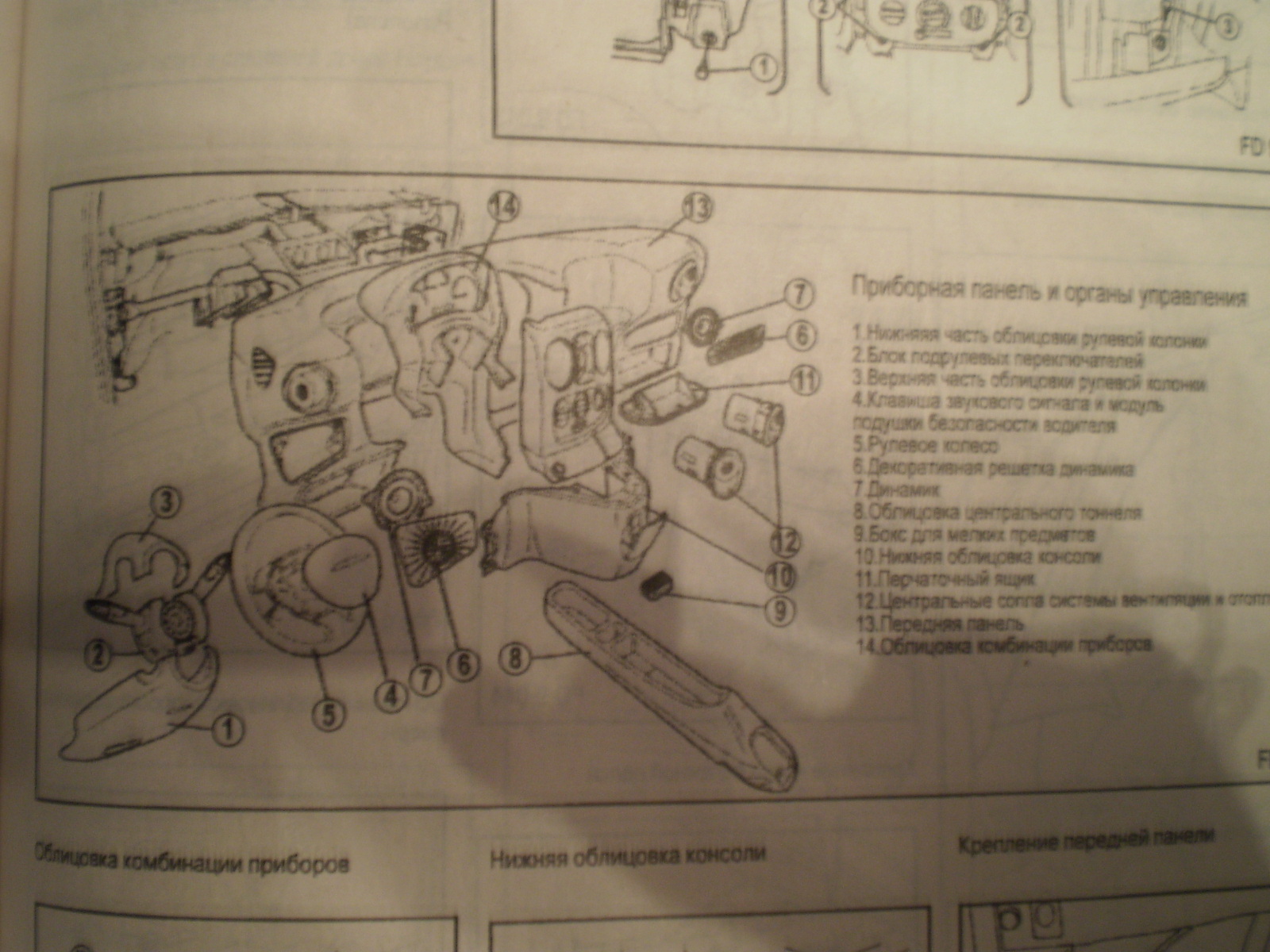Затем по бокам откручиваешь 4 самореза (нижняя панель 10 - на рисунке FD 9.038 - 1а. 1в.) и отводишь на себя немного всю эту открученную панель. Приподымаешь чехол с ручки скоростей.Затем аккуратно отключаешь разьём питания от зажигалки и бортового питания. И аккуратно на себя и вверх отводишь ту часть облицовки,где находится аварийка.Отключаешь от неё тоже разьём(если включится аварийка,то отключи её и после только отключай разьём).