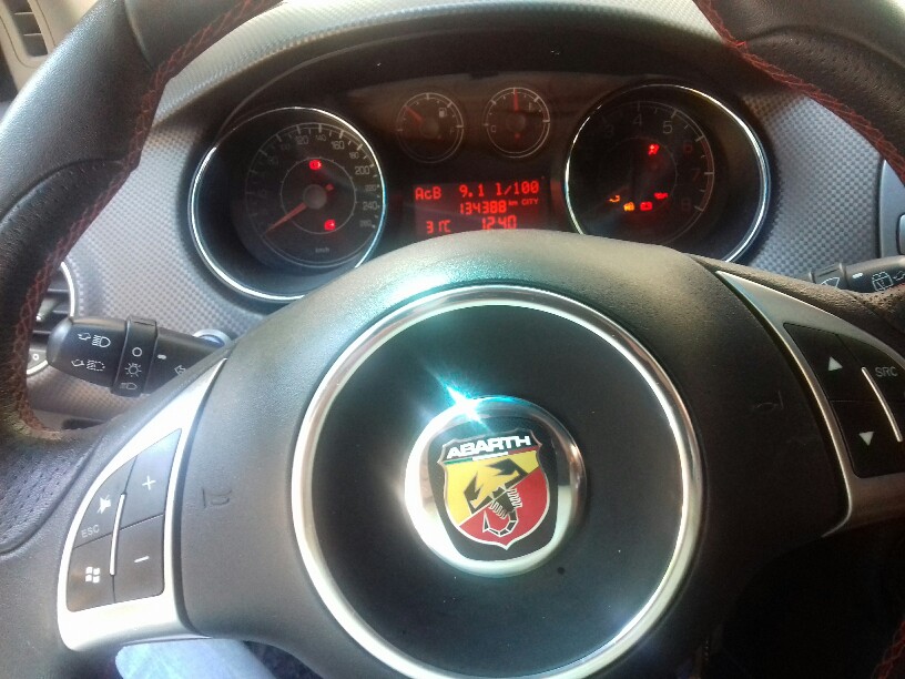 Кожаный руль Абарт, черный с красной строчкой, с подушкой безопасности. Куплен в богатые времена за почти 400$. Шикарен.